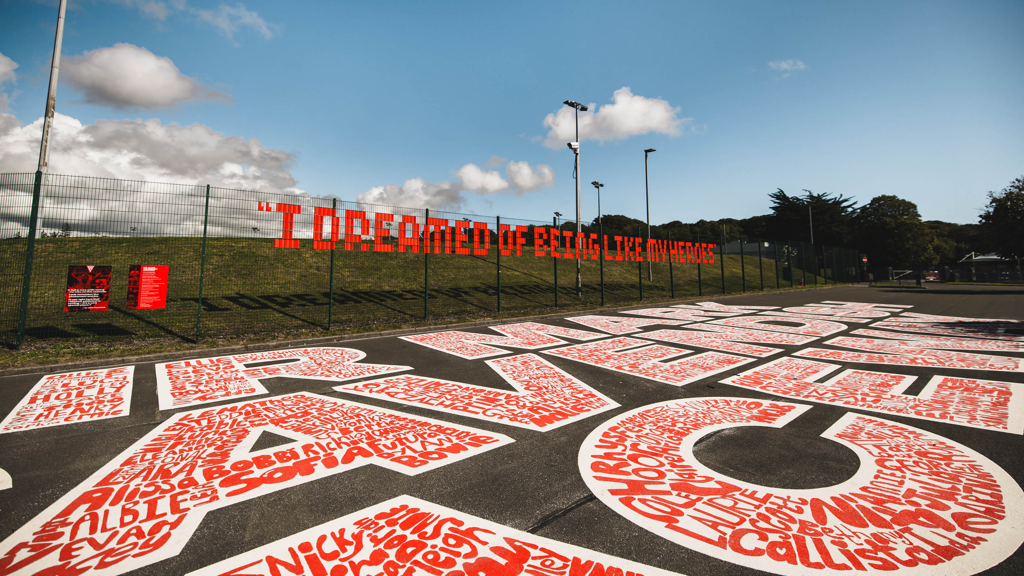 I wanted the project to be as much about participation as commemoration. By creating a simple worksheet we engaged over 5,000 children and local clubs. 1,000 of children's drawn names where then used to create the design for the floor mural. The 9.5m x 30m design was then added to the raceway using thermoplastic.
